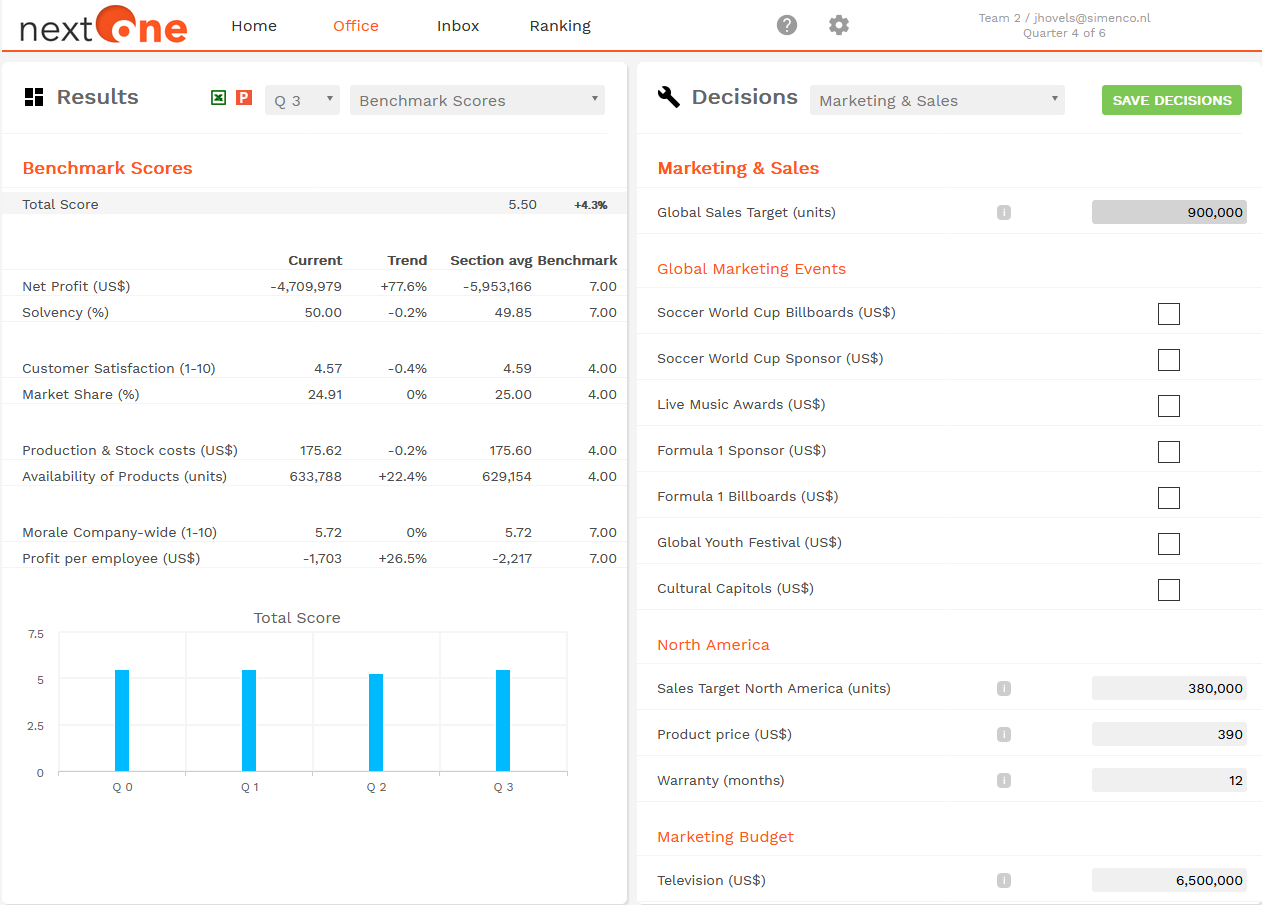 The players take the role of nextOne’s management team. For each period and for each branch, the team takes strategic, tactical, and operational decisions in the areas of research and development, purchasing, production & logistics, marketing & sales, finances, and HR-management.