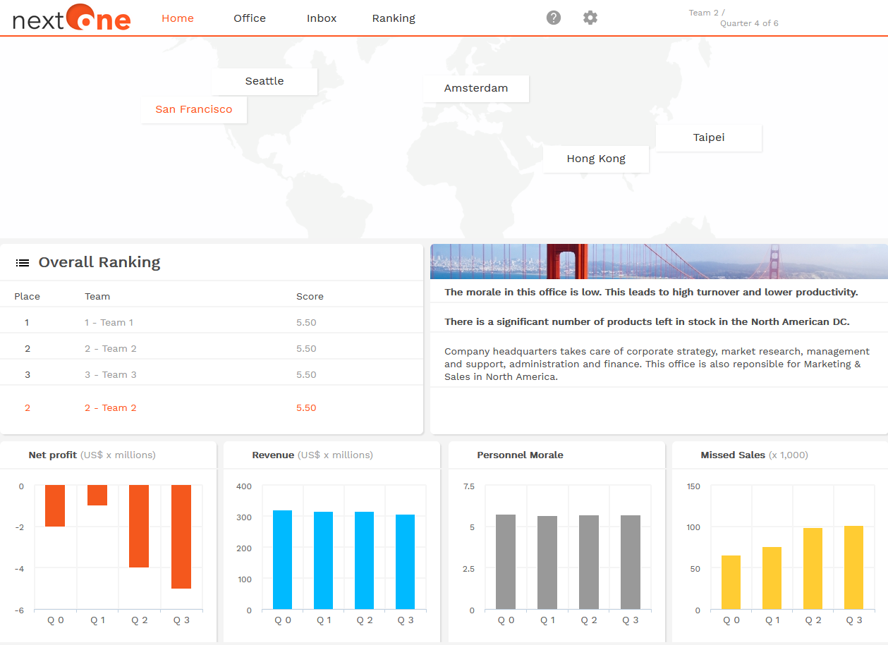 nextOne is one of Simenco’s most popular business games, developed with business professors and industry professionals. The game’s challenge is to manage a multinational company in a competitive market.
